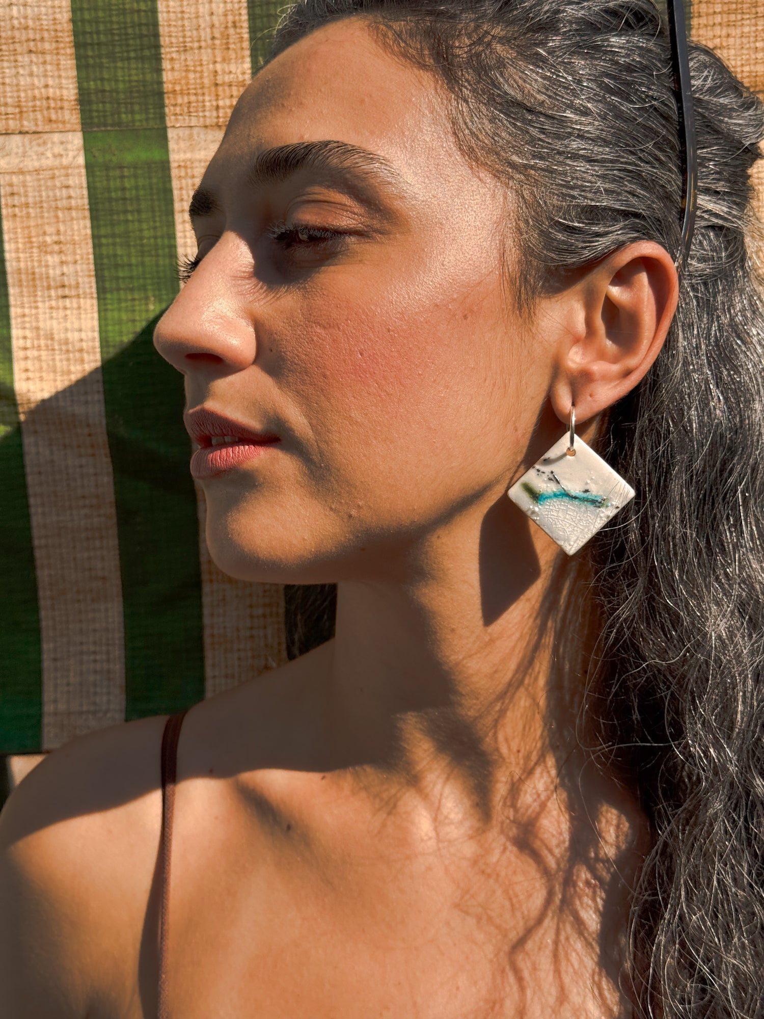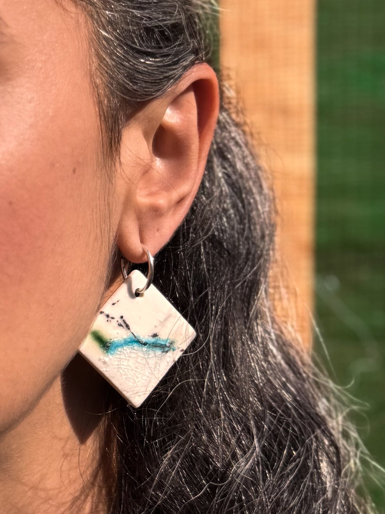 Brinco de porcelana na argola pequena de prata.